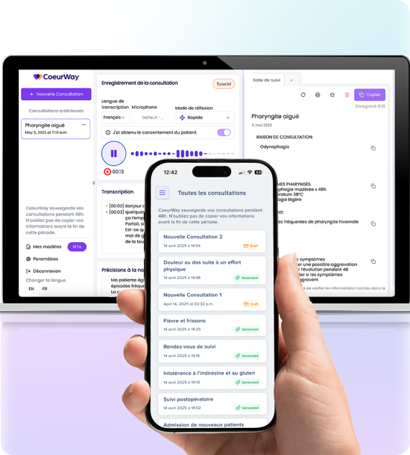 Documentez où que vous soyez avec CoeurWay mobile. Enregistrez vos consultations avec un audio cristallin, générez vos notes instantanément et retrouvez-les sur n’importe quel appareil pour les éditer ou les finaliser. Urgences, visites à domicile, consultations en clinique, votre documentation vous suit partout, avec ou sans poste de travail.